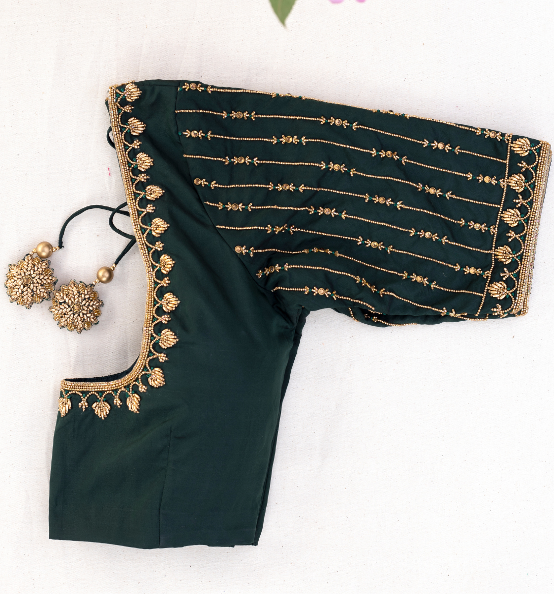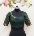 "A sophisticated dark green blouse with elegant embroidery, enhancing your outfit with timeless charm and a touch of intricate detailing."