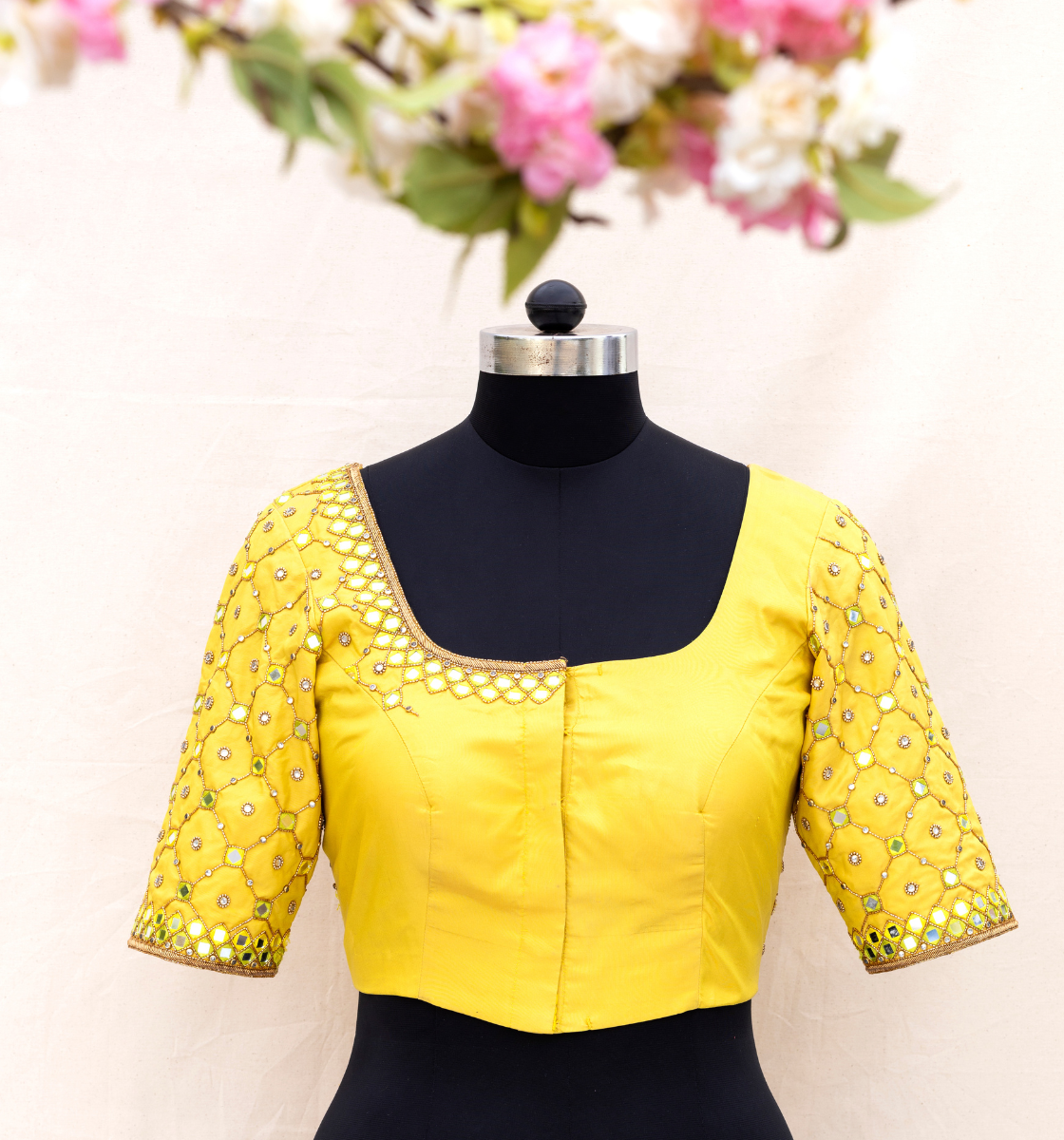 "A radiant lemon yellow blouse embellished with captivating mirror embroidery, adding a sunny and sparkling flair to your outfit for a vibrant and eye-catching look."