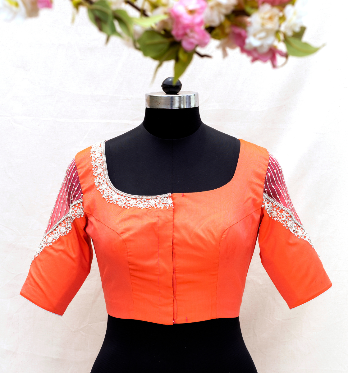 Peach Silk and Organza Blouse with Pearl Embroidery
