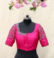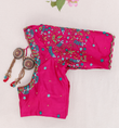 "A pink blouse adorned with intricate floral embroidery and a scalloped sleeve edge, blending femininity and artistic detail for an enchanting and stylish appearance."